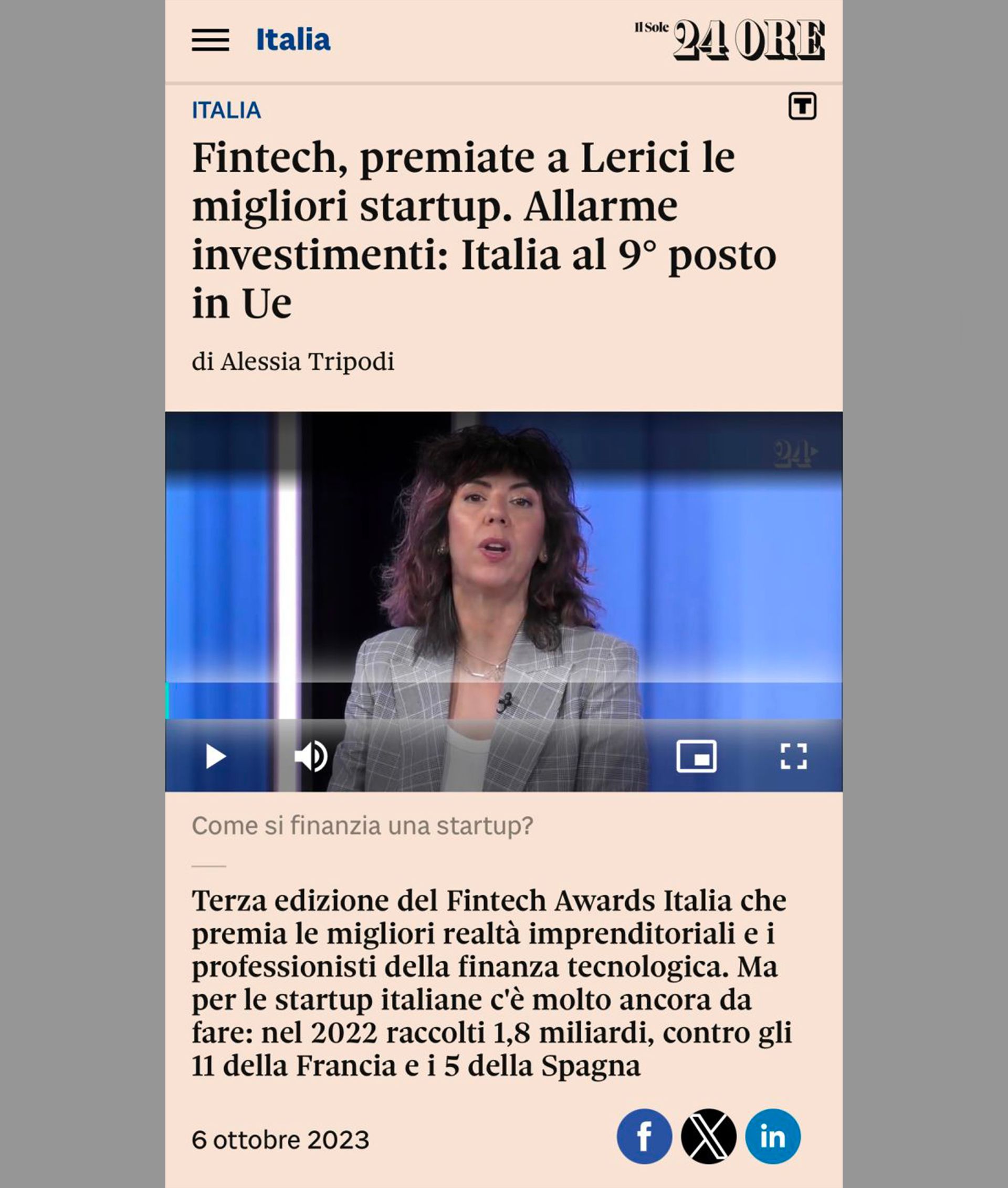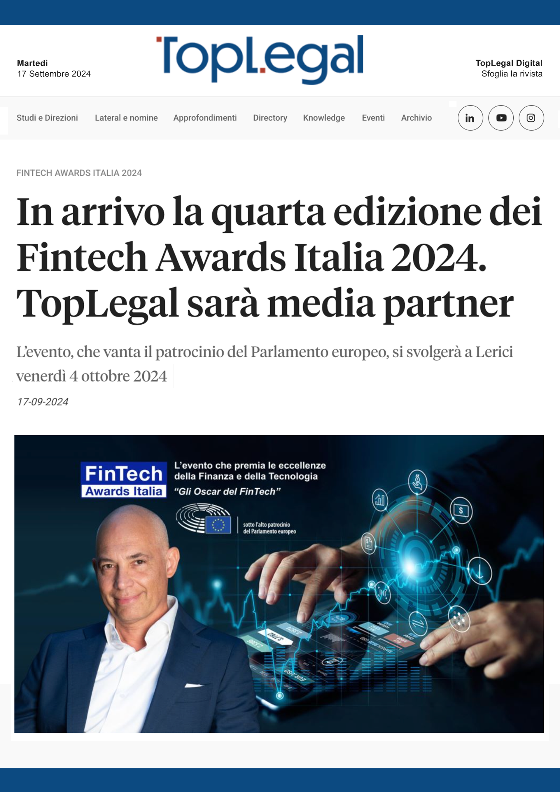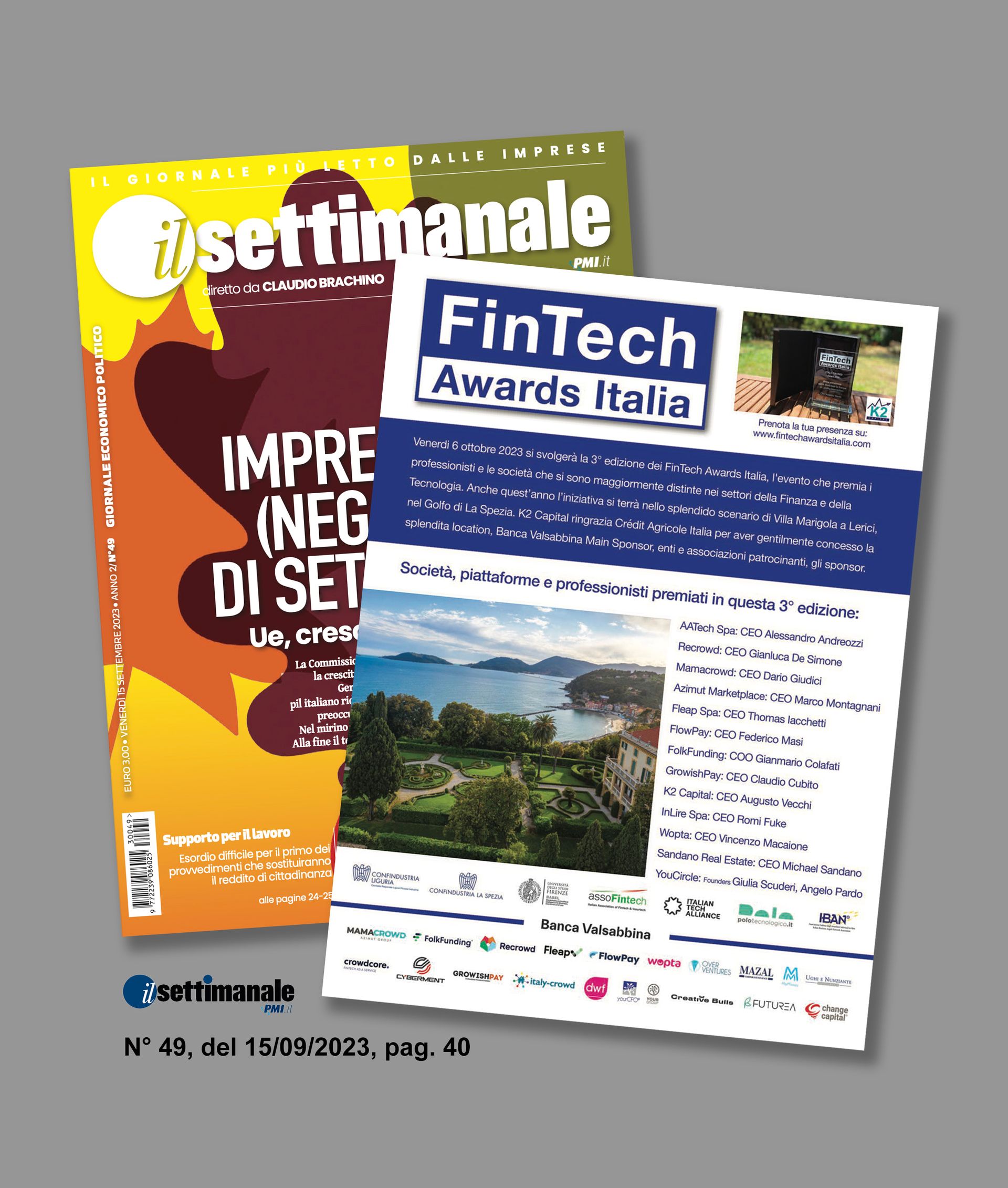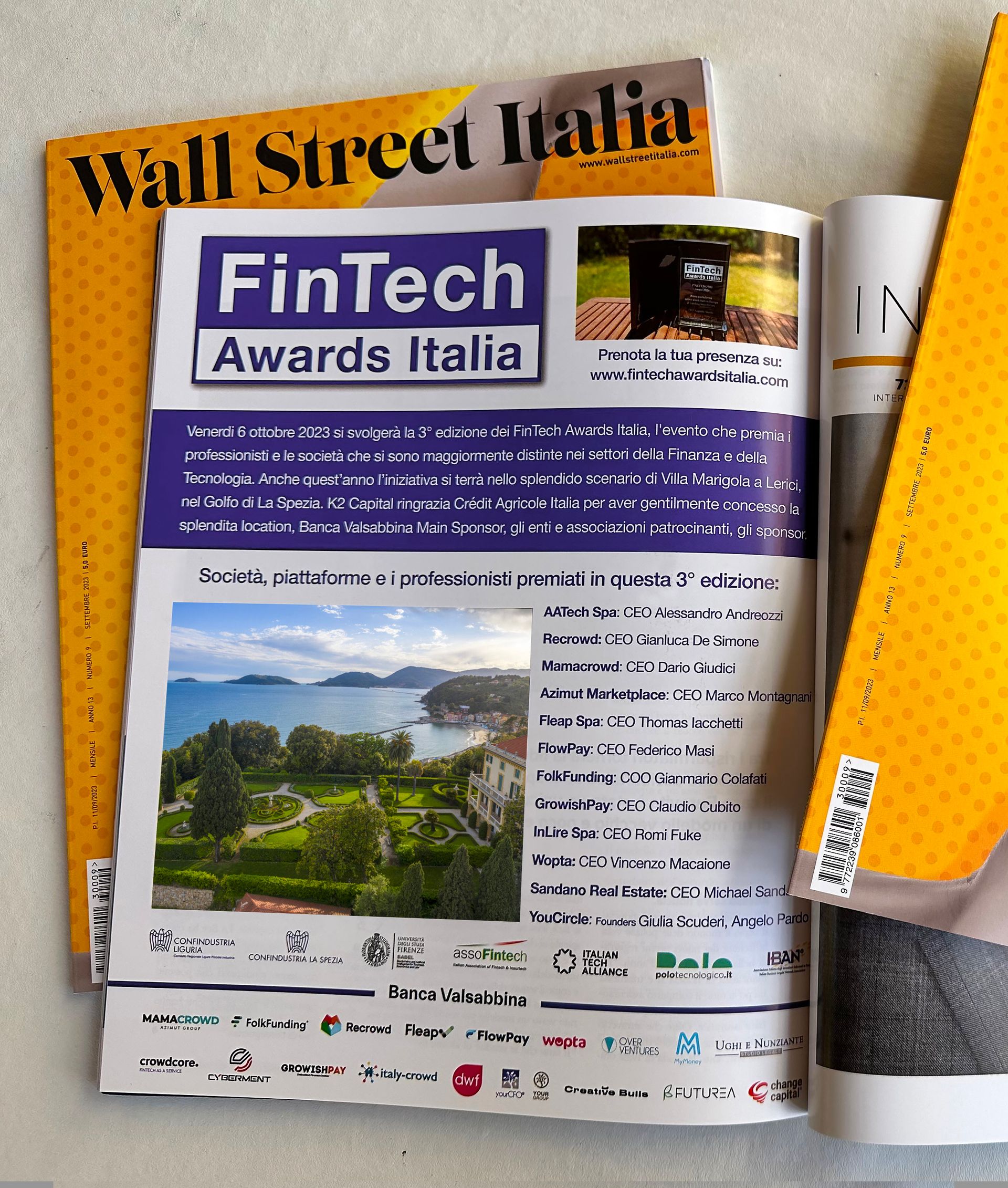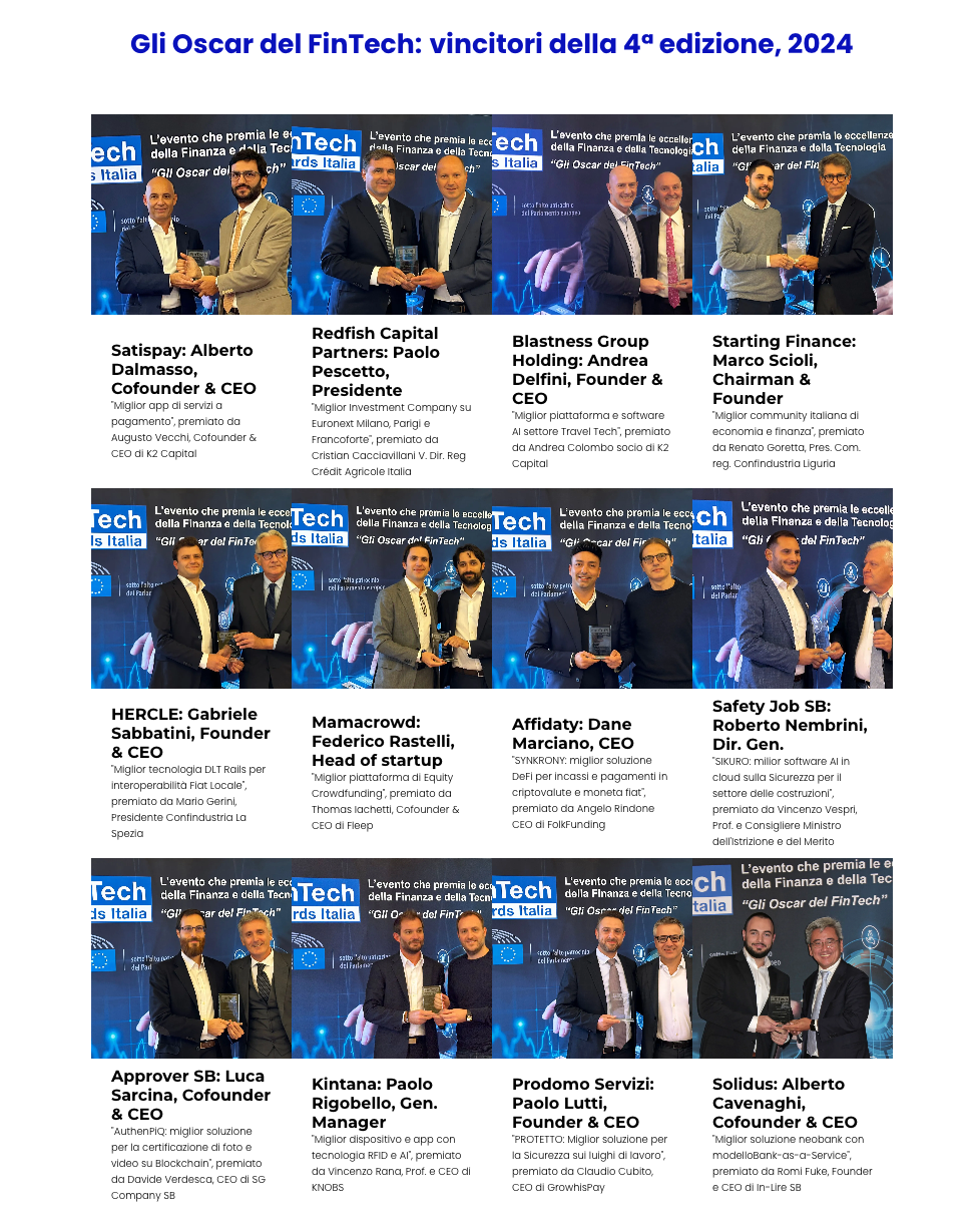 L'evento FinTech Awards Italia - Gli Oscar del FinTech, che nel 2025 giunge alla sua 5a edizione, è rivolto agli operatori della Finanza e della Tecnologia e si svolge nello splendido scenario di Villa Marigola a Lerici (SP), dove vengono consegnati gli Awards ai CEO che guidano le società e le piattaforme più performanti in ambito: Euronext Growth Milan, Equity crowdfunding, Lending immobiliare, Servizi alle imprese, Open banking , Servizi di pagamento, Insurtech, Credito alle Imprese, Sostenibilità ambientale e Sviluppo informatico.